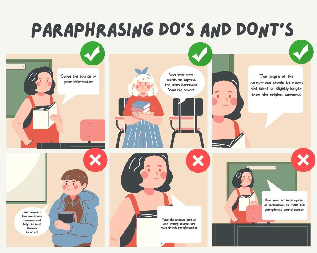 “In a paraphrase, you use your own words to explain the specific points another writer has made. If the original text refers to an idea or term discussed earlier in the text, your paraphrase may also need to explain or define that idea. You may also need to interpret specific terms made by the writer in the original text”