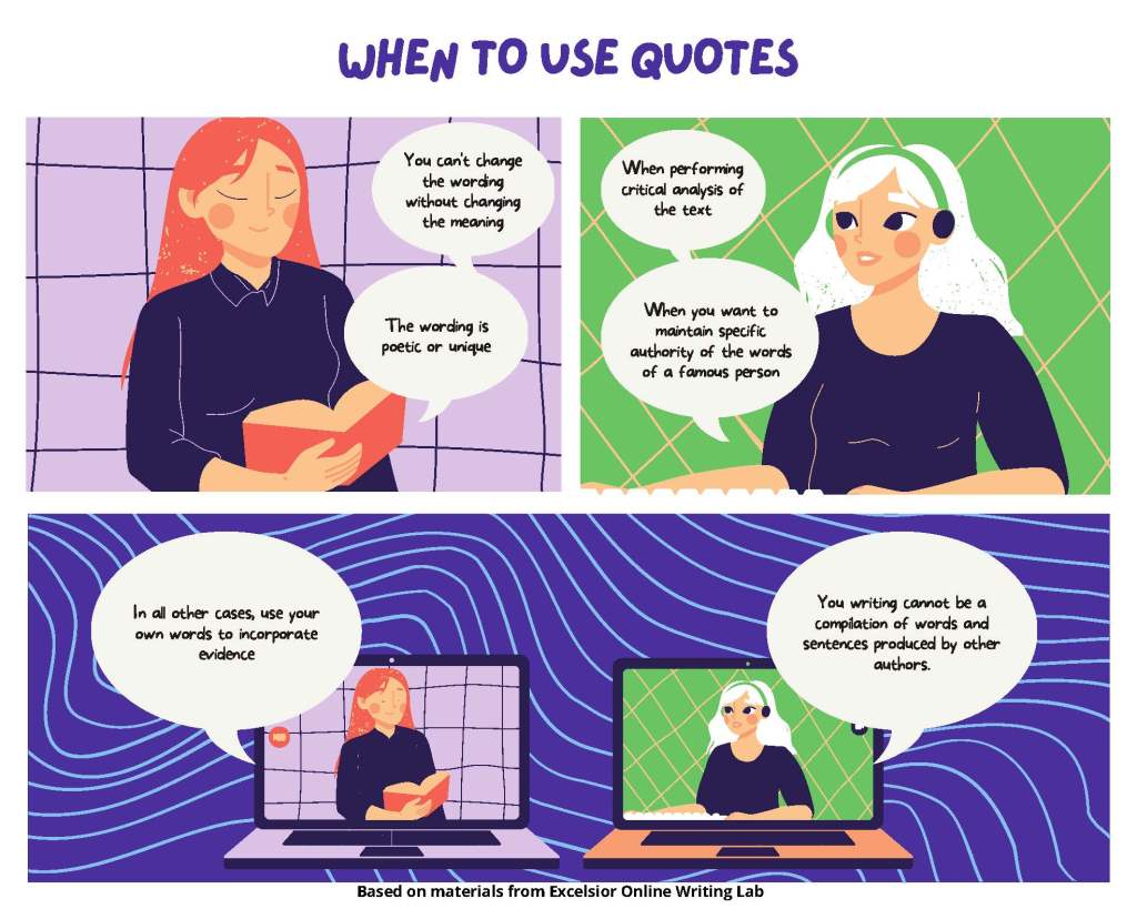 You quote a source when you use a word or several sentences the way they are presented in the original source enclosed in quotation marks (University of Michigan, 2021). You can use them to support your point or provide an example; however, do not attempt to substitute your own ideas with quotes. Use them when it is absolutely necessary to preserve the original language to make your point.